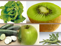 Kiwi, alface, pepino, almeirão, escarola, maçã verde; frutas,